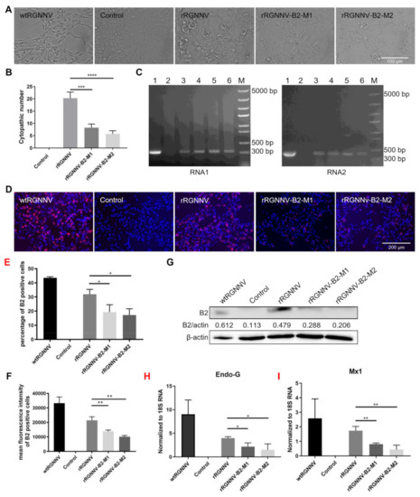 Biological characteristics of wtRGNNV, rRGNNV, rRGNNV-B2-M1, and rRGNNV-B2-M2 viruses. (A) CPE of recombinant RGNNV in SSN-1 cells. SSN-1 cells were incubated with wtRGNNV, rRGNNV, rRGNNV-B2-M1, and rRGNNV-B2-M2, and the CPE was observed at 3 dpi. (B) The CPE number statistics (*** p < 0.001; **** p < 0.0001). (C) Detection of RNA1 and RNA2. RGNNV RNA1 (left) and RNA2 (right) were detected by RT-PCR for the SSN-1 cells from (A), lane 1: SSN-1 cells infected with wtRGNNV was used as positive control; lane 2: Blank cells were used as negative control; lane 3 and 4: SSN-1 cells infected with rRGNNV-B2-M1; lane 5 and 6: SSN-1 cells infected with rRGNNV-B2-M2; M: DNA marker. (D) Immunostaining of B2 in RGNNV infected SSN-1 cells. SSN-1 cells were infected with wtRGNNV, rRGNNV, rRGNNV-B2-M1, and rRGNNV-B2-M2 at an MOI of 5. After 36 h, B2 was detected by immunofluorescence assay. Blank cells were used as negative control. (E,F) Statistics of B2 immunofluorescence. * p < 0.05, ** p < 0.01. (G) B2 was detected by Western blotting, and β-actin was used as the internal control. (H,I) the mRNA expression of Endo-G and Mx1 were detected by RT-qPCR. * p < 0.05; ** p < 0.01. Scale bar: 100 µm for (A), 200 µm for (D).