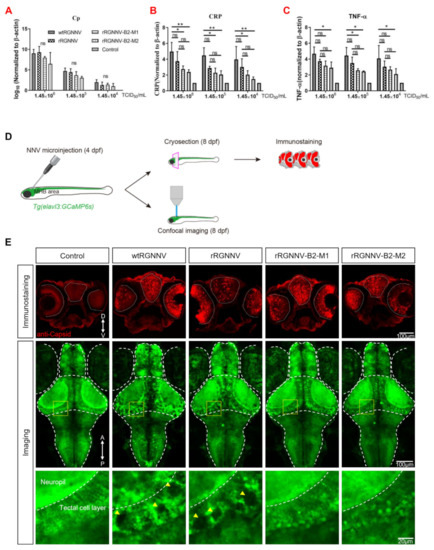 Virulence of wtRGNNV, rRGNNV, rRGNNV-B2-M1 and rRGNNV-B2-M2 viruses in zebrafish. (A) Virus load of zebrafish infected with wtRGNNV, rRGNNV, rRGNNV-B2-M1, or rRGNNV-B2-M2 was measured by RT-qPCR of RGNNV. Cp, capsid protein; ns, not significant. (B,C) The mRNA expression of C-reactive protein (CRP) and TNF-α in zebrafish infected with wtRGNNV, rRGNNV, rRGNNV-B2-M1, or rRGNNV-B2-M2 by RT-qPCR. * p < 0.05; ** p < 0.01; ns, not significant. (D) Schematics of the experimental procedure for viral infection and viral detection. (E) Immunofluorescence images of RGNNV capsid protein (Cp) (top) and projected transgenic fluorescence-image stacks (middle) from larval zebrafish without viral injection or with wtRGNNV, rRGNNV, rRGNNV-B2-M1 or rRGNNV-B2-M2 virus injection. Scale bars, 100 µm. D, dorsal; V, ventral. Enlarged view of the boxed regions in optic tectum were shown at the (bottom). Yellow arrowheads indicate massive tissue vacuolization. Scale bar, 20 µm. A, anterior; P, posterior. Data shown in (A–C) are mean ± SD of three independent experiments. * p < 0.05; ** p < 0.01; ns, not significant; by two-way ANOVA. All experiments were performed in triplicate.