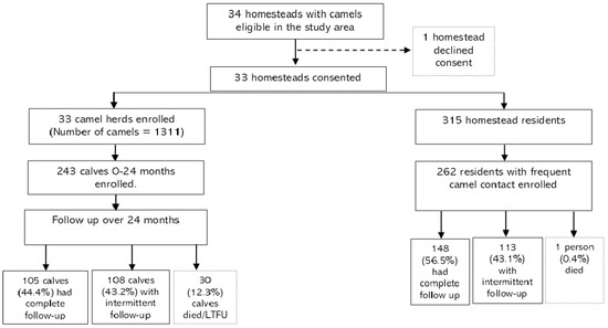 From April 2018 to March 2020, we enrolled and followed 243 camel calves (18.5%) from a total of 1311 camels in 33 homesteads. About half of the camel calves (51.0%) were females, and the median age of the cohort at enrollment was four months (interquartile range, IQR = 1–9 months). Most of the enrolled camels (88.1%) were maintained close to the homestead in the home herd.