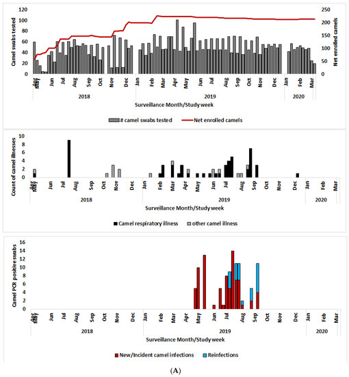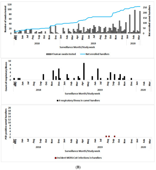 Figure 2. (A) Net enrollment, number of swabs tested, respiratory illness signs, and PCR positive swabs enrolled camels; (B) Net enrollment, number of swabs tested, respiratory illness signs, and PCR positive swabs enrolled camel handlers.