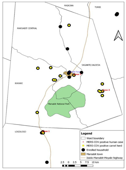 25. Ngere, I.; Munyua, P.; Harcourt, J.; Hunsperger, E.; Thornburg, N.; Muturi, M.; Osoro, E.; Gachohi, J.; Bodha, B.; Okotu, B.; et al. High MERS-CoV Seropositivity Associated with Camel Herd Profile, Husbandry Practices and Household Socio-Demographic Characteristics in Northern Kenya. Epidemiol. Infect. 2020, 148, 1–31. [Google Scholar] [CrossRef]