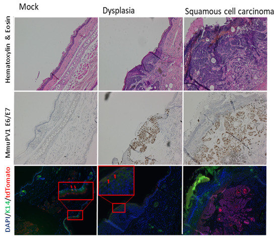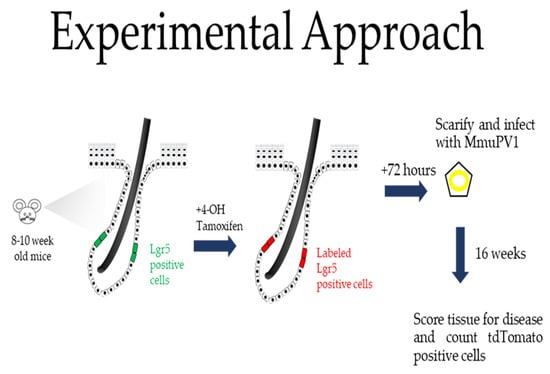 Experiments were performed on 8–10-week-old Lgr5 reporter mice, as schematically illustrated in Figure 1 and described in detail in the Materials and Methods section. Briefly, their ears were treated topically with 20 µL of 15 mg/mL 4-OH tamoxifen to activate Cre, which is selectively expressed in the LGR5+ epithelial progenitor cells, thereby turning on the expression of tdTomato in the same Lgr5+ epithelial progenitor cells as well as all of their descendants. Then, 3 days later, we infected the ears with MmuPV1 as previously described [28]. This involves lightly scarifying the epidermis to allow for infection by the virus. At 16 weeks post-infection, mouse tissue was harvested for routine histologic analysis and immunofluorescence.