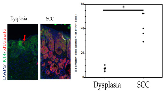 The disease sites contained evidence for the MmuPV1 E6/E7-specific nucleic acids as detected via RNAscope (Figure 2). To look for whether Lgr5+ progenitor cells had been infected and contributed to the lesions, we performed immunofluorescence for tdTomato. There were a few tdTomato+ cells within the inter-follicular epidermis of the mock-infected skin (Figure 2), which is expected as the infection process requires mechanical injury of the epidermis. The migration of Lgr5 progeny outside of the bulge region is well-documented in skin injury [29,30,31]. Based upon the studies cited above, which provided evidence for CRPV infecting the bulge region in rabbits and HPV oncogenes giving rise to lesions consisting of Lgr5 progeny, we predicted that squamous dysplastic lesions/papillomas caused by MmuPV1 would preferentially arise from Lgr5+ epithelial progenitor cells, but this is not what we found. Squamous dysplasia were found to contain only low numbers of tdTomato+ cells (Figure 2). In contrast, cutaneous squamous cell carcinomas (cSCC) appeared to have preferentially arisen from the infection of Lgr5+ epithelial progenitor cells because they had higher percentages of tdTomato+ cells (Figure 2). We quantified the abundance of tdTomato+ cells in five representative lesions scored by the pathologist as dysplasia or cSCC (Figure 3). The percent of tdTomato+ cells was quantified relative to keratin 14 (K14+) cells, a marker abundantly expressed in MmuPV1-infected squamous epithelium. Dysplastic tissue harbored on average 7% tdTomato+ cells while regions histologically representing cSCC harbored on average 42% tdTomato+ cells. This difference was highly significant (p = 0.008, two-sided Wilcoxon rank sum test).