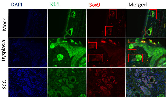 Strong Sox9 staining was restricted to hair follicles in mock-infected skin and dysplasia (see red boxes), with a low level of Sox9 staining found throughout the dysplasia. Higher level Sox9 staining was evident throughout cSCC. Tyramide signal amplification (TSA) was used to detect Sox9. K14 staining intensity was variable amongst SCC. Images were taken at 400× magnification.