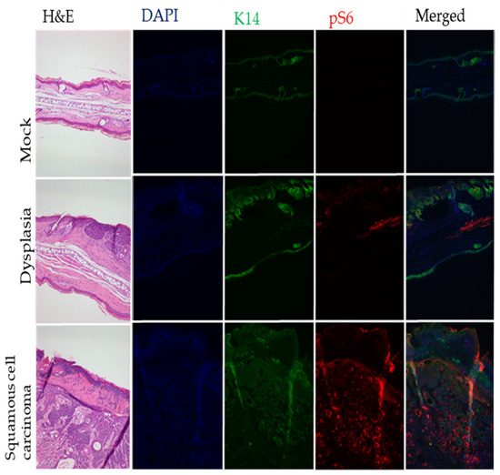 Representative images depict biomarker expression within experimental mice. TSA was used to detect pS6. Note the increased expression of pS6 in cSCC lesions. Images were taken at 200× magnification.