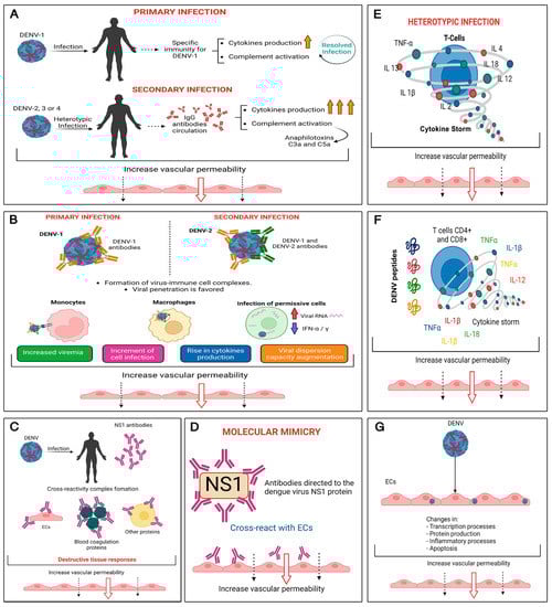Molecular mechanisms associated with ED due to DENV. (A) Vascular permeability mediated by antigen (virus) + antibody (anti-virus) + complement proteins: in secondary heterotypic infection, the circulation of DENV-specific IgG antibodies activates the production of anaphylatoxins C3a and C5a of the complement system that mediate vascular permeability. (B) Antibody-mediated potentiation of the infection: in a secondary heterotypic infection (SHI), the antibodies from primary infection recognize and form complexes with the DENV serotype involved the secondary infection (reinfection). These complexes bind to monocytes and macrophages through Fc receptors that favors the viral entry, increasing the number of infected cells, viremia, and the cell-to-cell viral spread capacity that affects endothelial permeability. In addition, direct infection of permissive cells causes an intrinsic antibody-dependent enhancement (iADE) where viral replication and the consecutive production of viral RNA generate a downregulation on interferon alpha and gamma (IFN α/γ), and an upregulation of different cytokines that can be directly related to endothelial damage. (C,D) Heterophilic immunity and molecular mimicry: during DENV infection, antibodies directed against the NS1 protein are generated; these antibodies have cross-reactivity with ECs, blood coagulation proteins, and other cells such as hepatocytes. These antibodies, considered as mimetics, reach a pathogenic potential during a SHI, generating destructive responses in the endothelium. (E) Exaggerated T cell response: during SHI, different memory T cells release exaggerated amounts of cytokines that affect vascular permeability. (F) T cell response, guided by antigenic sin (tendency of immune system to preferentially use immune memory based on a previous infection when a second, slightly different version of this foreign entity is encountered): different variants of DENV peptides induce the production of different sets of cytokines. The response of T cells influenced by antigenic sin causes the uncontrolled cytokine production (cytokine storm), which increases vascular permeability. (G) Direct infection of ECs: DENV can directly infect ECs, triggering processes such as apoptosis and generating products that increase vascular permeability [38,45,46].