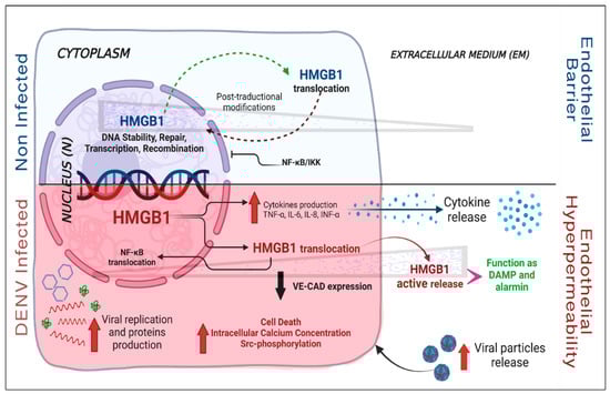 A recent study showed that infection of A549 cells with DENV-2 for 24 h (MOI of 5) induced HMGB1 accumulation in the cytoplasm and its subsequent release. This study showed that treating cells with EP increased the transcription of viral NS5 and capsid proteins, inhibiting HMGB1 release in infected cells. In a complementary way, the silencing of HMGB1 in these cells resulted in a reduction in viral RNA (~75%) and infectious viral particles according to titration assays. Likewise, a decrease in the mRNA expression of TNF-α, IL-6, IL1β, NF-kB, and IFN-β was observed, indicating that HMGB1 has a pro-viral effect on infected cells, mediated by proinflammatory cytokine expression and dependent on NF-kB activity, allowing viral replication and spreading [99]. Figure 3 summarizes the above-mentioned effect of HMGB1 in endothelial cells with and without DENV infection.