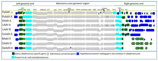 Schematic diagram of atadenovirus genome comparison. Complete atadenovirus genomes were extracted from the following: NCBI (passerine adenovirus 1 (PaAdV-1), GenBank Ac no. MT674683; Psittacine atadenovirus A (PsAdV-A), GenBank Ac no. KJ675568; Duck adenovirus A (DAdV-A), GenBank Ac no. KF286430; Lizard atadenovirus A (LadV-A), GenBank Ac no. KJ156523; Lizard atadenovirus B (LadV-B), GenBank Ac no. MT050041; Snake atadenovirus B (SnAdV-B), GenBank Ac no. DQ106414; Bovine atadenovirus B (BadV-B), GenBank Ac no. JQ345700; Ovine atadenovirus A (OadV-B), GenBank Ac no. NC_004037 and Deer atadenovirus B (DeAdV-B), GenBank Ac no. MK343439) and they were aligned with MAFTT (version 7.388) [] in Geneious Prime® (version 2022.1.1, Biomatters, New Zealand). Adenovirus conserved genes, genus-specific genes, and species-specific hypothetical open reading frames are presented in different colours. The significance of missing conserved genes in the presented genomes is marked with X, and genes present, but not annotated are represented with a star (*). F-1 and F-2 are the abbreviations for fibre 1 and 2, respectively.