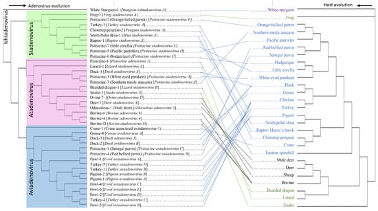 The following are available online at https://www.mdpi.com/article/10.3390/v14081767/s1, Table S1: Details of sequences used in the Tanglegram; Table S2: Similarity (%) across five different genera using amino acids sequences of selected complete DNA pol gene. Blosum62 with threshold 1 (percentage of residues which have score ≥ 1 in the Blosum62 matrix) parameter was chosen in Geneious Prime® (version 2022.1.1, Biomatters, New Zealand) to calculate % similarity; Table S3: Details of sequences used in the phylogenetic tree; Figure S1: Phylogenetic tree was generated using concatenated amino acid sequences of four genes (DNA polymerase, penton, hexon, and pTP), Figure S2; Phylogenetic tree was generated using adenovirus DNA polymerase, and Figure S3; Phylogenetic tree was generated using Cytochrome c oxidase 1 subunit of representative hosts.