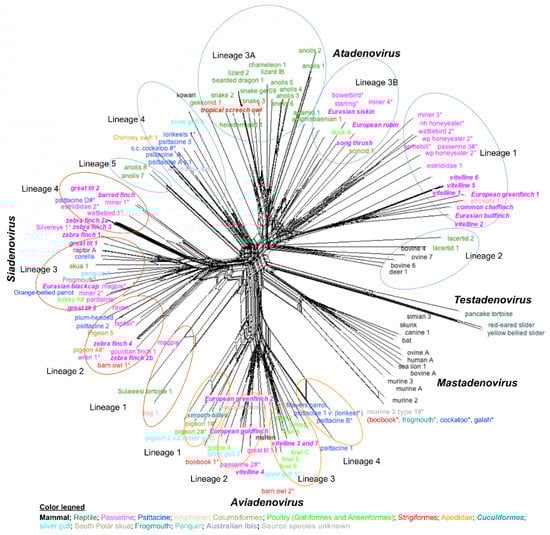 Bootstrap network analysis using partial DNA polymerase gene amino acid sequences. Bootstrap values that exceeded 80% are highlighted with line weight as generated by SplitsTree software. Groups of host species were coloured as shown in the colour legend. Murine adenovirus 2 variant 1 was found in the four species of birds in parenthesis; however, it is suspected to be of murine origin. Virus sequences identified in the study conducted by Vaz et al. (2020) [] were shown with an asterisk (*), whereas adenoviruses identified with a hashtag (#) were found in more than one species of bird, either in the study by Vaz et al. (2020) [], and/or one or more studies by others [,,,,,,,,,,,,,,,,,,,,,,,]. Recent adenovirus sequences reported from Europe [] and South America [] were also included and highlighted with a bold and italic font. Lineages are designated according to Vaz et al. (2020) [].