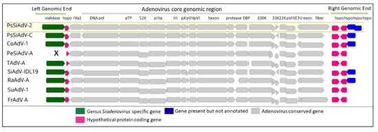 Schematic representation of siadenovirus genome comparison. Complete siadenovirus genomes were extracted from the following: NCBI (Psittacine siadenovirus F (PsSiAdV-F), GenBank Ac no. MW365934; Psittacine siadenovirus C (PsSiAdV-C), GenBank Ac no. MN687905; Corella adenovirus A (CoAdV-A), GenBank Ac no. MK227353; Penguin siadenovirus A (PeSiAdV-A), GenBank Ac no. KP144329; Turkey adenovirus A (TAdV-A), GenBank Ac no. AC_000016; Siadenovirus—strain IDL 19 (SiAdV-IDL 19), GenBank Ac no. MK695679; Raptor adenovirus A (RaAdV-A), GenBank Ac no. EU715130; Skua adenovirus B (SuAdV-B), GenBank Ac no. HM585353 and Frog siadenovirus A (FrAdV-A), GenBank Ac no. NC_002501); they were aligned with MAFTT (version 7.388) [] in Geneious Prime® (version 2022.1.1, Biomatters, New Zealand). Adenovirus conserved genes, genus-specific sialidase, genes common and species-specific hypothetical proteins were presented in different colours. The significance of missing conserved gene is marked with X.