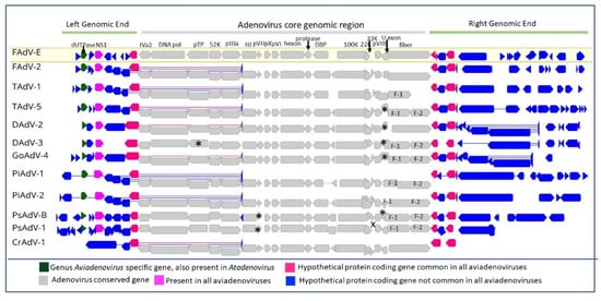 Schematic illustration of aviadenovirus genome comparison. Complete aviadenovirus genomes were extracted from the following: NCBI (Fowl aviadenovirus E (FAdV-E), GenBank Ac No. KT862808; Fowl aviadenovirus D (FAdV-D), GenBank Ac No. KT862805; Turkey aviadenovirus B (TAdV-B), GenBank Ac No. GU936707; Turkey aviadenovirus D (TAdV-D), GenBank Ac No. KF477313; Duck aviadenovirus B (DAdV-B), GenBank Ac No. KJ469653; Duck adenovirus 3 (DAdV-3), GenBank Ac No. MW677606; Goose aviadenovirus A (GoAdV-A), GenBank Ac No. JF510462; Pigeon aviadenovirus A (PiAdV-A), GenBank Ac No. MW286325; Pigeon aviadenovirus B (PiAdV-B), GenBank Ac No. KX121164; Psittacine aviadenovirus B (PsAdV-B), GenBank Ac No. KX577802; Psittacine aviadenovirus C (PsAdV-C), GenBank Ac No. MH580295 and crane-associated adenovirus 1 (CrAdV-1), GenBank Ac No. LC469780); they were aligned with MAFTT (version 7.388) [] in Geneious Prime® (version 2022.1.1, Biomatters, New Zealand). Conserved adenovirus genes, genus common and species-specific hypothetical ORFs and genes shared by both avidenovirus and mastadenoviruses were presented in different colours, as per the given guide. Conserved genes that are not present in genomes are marked with X, and genes present but not annotated are represented with a star (*). F-1 and F-2 are the abbreviations for fibre 1 and 2, respectively.
