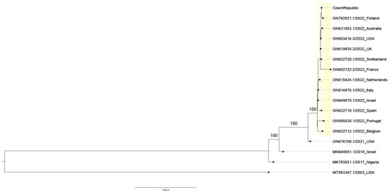 Phylogenetic analysis performed using the assembled genome of the sample confirmed its clear association with the current outbreak (see Figure 2). The genome presented here is basically indistinguishable from the others of the ongoing outbreak, which might indicate stability of the lineage in its current environment/host or represent a typical behavior of slow-evolving dsDNA virus whereas some reports suggested that the Monkeypox lineage now circulating in Europe experienced, at least for some period, faster/rapid evolution, i.e., accumulated higher number of mutations than could be expected [].