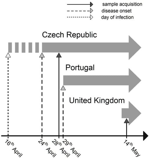 Timeline of the earliest reported Monkeypox virus infections from the European outbreak; only cases with no direct link to Africa were considered. Concerning the case from the Czech Republic, we provide three different dates: “sample acquisition” refers to a date when biological sample was acquired for molecular analyses; “disease onset” refers to a date when first symptoms of the disease were manifested; “day of infection” refers to a date when the infection was presumably transmitted (risk contact). Concerning the Portugal and United Kingdom cases, we report dates that were publicly available [,].