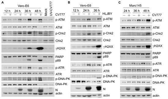PEDV infection activates ATM-dependent DNA damage response. (A) Western blots were prepared with extracts from Vero-E6 cells uninfected or infected with CV777 (0.1 MOI) for 12, 24, 36, and 48 h. The levels of p-ATM (S1981), total ATM, p-Chk2(T68), total Chk2, p-ATR(T1989), total ATR, p-DNA-PK(S2056), total DNA-PK, γH2AX, PEDV N, and actin were determined using their respective antibodies. Vero-E6 cells infected with UV-inactivated CV777 (0.1 MOI) for 48 h were used as the negative control. (B) Western blots were prepared with extracts from Vero-E6 cells uninfected or infected with HLJBY (0.1 MOI) for 12, 24, and 36 h. (C) Western blots were prepared with extracts from Marc145 cells uninfected or infected with CV777 (0.1 MOI) for 24, 36, and 48 h at 0.1 MOI.