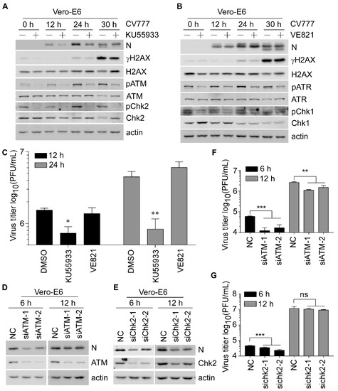 Viruses have evolved sophisticated tactics to optimize the intracellular environment by hijacking cellular signaling pathways for their replication. The DNA damage response (DDR) is a complex three-tiered signaling cascade that is mediated by ataxia telangiectasia mutated (ATM), ATM and Rad3 related (ATR), and DNA-dependent protein kinase (DNA-PK), leading to DNA repair, cell cycle arrest, and apoptosis according to the extent of damage [1,2,3,4]. As a causative factor in oncogenesis and chronic inflammation, the interplay between DDR and oncogenic viruses has been extensively studied. However, many non-oncogenic RNA viruses can also induce DDR [5]. For example, hepatitis C virus (HCV) infection stimulates the production of Nitric oxide (NO) and Reactive oxygen species (ROS) and subsequently induces DNA damage and genetic abnormalities [6,7]. Infectious bronchitis virus (IBV), a member of the Coronaviridae family, activates the replicative stress and ATR pathway through the interaction between the nsp13 and DNA polymerase δ, leading to the S-phase arrest, which benefits viral replication [8]. A recent study showed that severe acute respiratory syndrome coronavirus 2 (SARS-CoV-2) infection also activates the ATR-Chk1 pathway and induces H2AX phosphorylation [9].