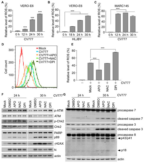 PEDV-induced cellular ROS contributes to the activation of the ATM signaling. (A) ROS levels were measured with Vero-E6 cells uninfected or infected with CV777 (1 MOI) for 12, 24, and 30 h. The relative ROS levels were calculated by the DCF fluorescence intensity in PEDV-infected cells. Results are representative of three independent experiments. (B) ROS levels were measured with Vero-E6 cells uninfected or infected with HLJBY (1 MOI) at 18, 24, and 30 h. (C) The experiment was performed as in A, except using Marc145 cells. (D) ROS levels were measured in Vero-E6 cells pre-treated with DMSO, APO (1 mM), NAC (100 μM), or DPI (0.5 μM) for 2 h and followed by CV777 (1 MOI) infection in the presence of DMSO, APO (1 mM), NAC (100 μM), or DPI (0.5 μM) for 24 h. (E) The quantification of the relative ROS levels calculated by the DCF fluorescence intensity in cells that were treated as in (D). Results are representative of three independent experiments. (F,G) Western blots were prepared with extracts from Vero-E6 cells treated with DMSO, APO (1 mM), NAC (100 μM), or DPI (0.5 μM) for 2 h before and during infection with CV777 (1 MOI) for 24 and 30 h (*** p < 0.001).