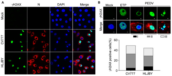 Typical γH2AX foci by IFA have been widely used as a biomarker of DNA double-strand breaks (DSBs) upon treatment with genotoxic reagents or irradiation [34]. Therefore, we analyzed the nuclear immunostaining of γH2AX in PEDV-infected Vero-E6 cells (Figure 4A). Unlike etoposide, a topoisomerase II inhibitor, induced bright punctate γH2AX foci distributed throughout the nucleus, PEDV-induced γH2AX staining tended to be a confluent pattern that could be subdivided into three phases (Figure 4B, upper panel), including phase I (nuclear ring staining), phase II (pan-nuclear staining), and phase III (co-staining with shrunken apoptotic bodies), which highly resembled TNF-related apoptosis-inducing ligand (TRAIL)-induced γH2AX activation [35,36]. Quantification of γH2AX staining in each phase showed that over 40% were nuclear γH2AX staining; among these, around 80% of γH2AX positive cells were in phases II and III, consistent with the progression of cell death upon PEDV infection (Figure 4B, lower panel).