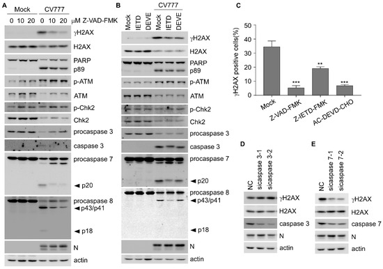 PEDV-induced phosphorylation of H2AX is decreased by caspase inhibitors. (A) Western blots were prepared with extracts from Vero-E6 cells treated with DMSO or caspase pan-inhibitor Z-VAD-FMK (0, 10, and 20 μM) for 2 h before and during infection with CV777 (0.5 MOI) for 30 h. (B) Western blots were prepared with extracts from Vero-E6 cells treated with DMSO or caspase-8 inhibitor Z-IETD-FMK (50 μM), or caspase-3/7 inhibitor Ac-DEVD-CHO (50 μM) for 2 h before and during infection with CV777 (0.5 MOI) for 30 h. (C) IFA was performed with Vero-E6 cells treated with DMSO, Z-VAD-FMK (10 μM), Z-IETD-FMK (50 μM), and Ac-DEVD-CHO (50 μM) for 2 h, respectively, before and during infection with CV777 (0.5 MOI) for 30 h. The cells were fixed and double-immunostained with specific rabbit anti-γH2AX and mouse anti-N antibodies. The nuclei were stained with DAPI. The graph shows the percentage of γH2AX positive cells in about 200 PEDV-infected cells. (D,E) Western blots were prepared with extracts from Vero-E6 cells transiently transfected with 50 nM scramble or caspase-3/7 siRNA for 48 h, followed by 1 MOI CV777 infection for 25 h (** p < 0.01; *** p < 0.001).
