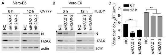 Silencing H2AX decreases PEDV replication. (A,B) Western blots were prepared with extracts from Vero-E6 cells transiently transfected with 50 nM scramble or H2AX siRNA for 48 h, followed by 1 MOI CV777 (A) or HLJBY (B) infection for 6 and 12 h. (C) Western blots were prepared with extracts from Vero-E6 cells transfected with 50 nM scramble or H2AX siRNA for 48 h, followed by 1 MOI CV777 infection for 6 and 12 h. The cells and supernatants were collected for PFU assay (** p < 0.01; *** p < 0.001).