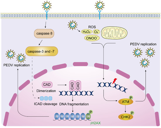 The interplay between PEDV replication and cellular DNA damage response. After PEDV enters host cells and replicates in the cytoplasm, the accumulation of massive intracellular ROS activates ATM-mediated DSB. Activated ATM and its downstream substrate Chk2 facilitate viral replication in the early infection stage. In the late stage of PEDV infection, the initiator caspase-8 activates the executioner caspase-3 and caspase-7 which subsequently cleave ICAD and release CAD from the ICAD-CAD complex and promote the homodimerization of CAD. The scissor-like CAD dimers create DSBs in the genome and DNA fragmentation, leading to H2AX phosphorylation in the nucleus. Inhibition of H2AX, ATM, and Chk2 dampens the replication of PEDV.