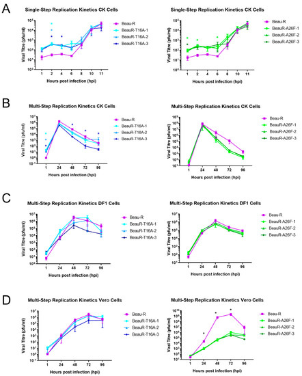 Confluent CK, DF1 or Vero cells, seeded in 6-well plates were infected with 500 µL of Beau-R, BeauR-T16A or BeauR-A26F isolates at a titre of either 1 × 104 or 1 × 105 PFU and incubated at 37 °C for 1 h with 5% CO2. The virus was removed, and the cells were washed twice with PBS followed by the addition of 3 mL BES media. The supernatant containing the infectious progeny was harvested at either 1, 24, 48, 72 and 96 hpi, to establish replication over multiple rounds of viral replication, or at 1, 2, 4, 6, 8, 10 and 11 hpi, to assess replication over the first round of viral replication. The quantity of infectious progeny was quantified in triplicate via plaque assay in CK cells.