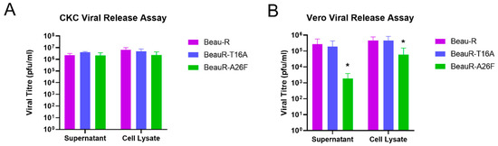 BeauR-A26F exhibits reduced cell release during infection of Vero cells. Confluent (A) CK cells and (B) Vero cells seeded in 6 well plates were infected at 1 × 10⁴ PFU (MOI~0.008) of either Beau-R, BeauR-T16A-1 or BeauR-A26F-3. Supernatant and cell lysates were harvested at either (A) 24 hpi or (B) 72 hpi and the quantity of infectious progeny determined via plaque assay in CK cells. Error bars represent ± SEM of three independent experiments. Statistical analysis was carried out using a one-way ANOVA, significance was taken as p-value < 0.05, represented as *. Significance shown in relation to Beau-R.