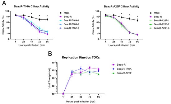 TOCs, singly plated in glass tubes, were washed twice with PBS. In replicates of ten, each TOC was inoculated with 500 µL TOC infection medium [30], containing 1 × 104 PFU of Beau-R, BeauR-T16A or BeauR-A26F isolates. Mock infected TOCs were inoculated with 500 µL TOC medium. Tubes were incubated upright for 1 h at 37 °C, after which the inoculum was removed and the TOCs washed twice with PBS. 1ml of TOC infection media was added per tube, and the TOCs were incubated at 37 °C, 1 revolution per 7 min. The ciliary activity of each TOC was assessed at 24 h intervals using a light microscope, and the percentage of cilia beating was calculated as described [38,39].