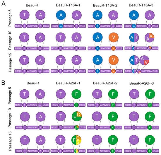 Selective pressure exists to maintain T16 and A26 residues upon passage in CK cells. The transmembrane domain of the E gene is shown, as that is where all mutations were found. The circles highlight the T16 and A26 residues, except in the case of BeauR-T16A-3 at passage 15 in which A17 is highlighted. Larger circles represent a pie chart of the four replicates of each isolate at each passage showing the sequences present. Every 5 passages, the supernatant was harvested, and Sanger sequenced over the E gene to detect any mutations generated. Mock wells did not contain any virus at each round of screening through RT-PCR. (A) Four replicates of each isolate of BeauR-T16A virus were passaged alongside Beau-R and media mock wells for 15 passages, diluted 1 in 10 at each round. The Beau-R sequence is shown in purple, T16A mutation is shown in blue, A26V is shown in orange, and A17V is shown in red. (B) Four replicates of each isolate of BeauR-A26F were passaged 15 times alongside Beau-R and mock infected wells. Beau-R sequence is shown in purple, the A26F mutation is shown in green, F26C is shown in orange, and F26S is shown in yellow.