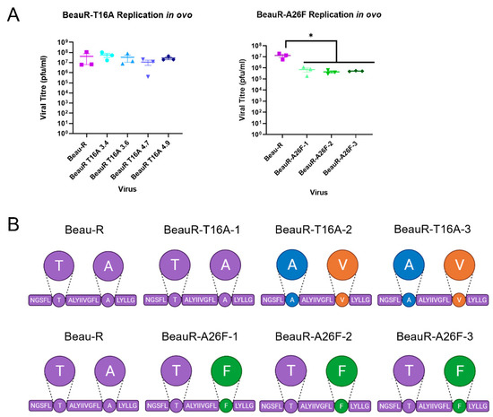 Reduced replication or genetic stability of rIBVs in ovo. Eggs were infected at a titre of 1 × 10⁵ PFU (MOI~0.08) for Beau-R and all isolates of BeauR-T16A and BeauR-A26F. (A) The allantoic fluid from the eggs was harvested at 24 hpi and titrated on CK cells to determine the quantity of virus present. Error bars represent ± SEM of three independent experiments. Statistical analysis was carried out using a one-way ANOVA with significance taken as p-value < 0.05 in comparison to Beau-R and is indicated by *. (B) The schematic represents the transmembrane domain of the E protein with the T16 and A26 residues highlighted with circles. Three replicates of each virus were harvested, and Sanger sequenced over the E gene. Beau-R sequence is shown in purple, T16A is shown in green, A26V is shown in orange, and A26F is shown in green.