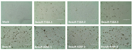 CK cells seeded into 6-well plates were inoculated with 1 × 105 PFU of Beau-R, BeauR-T16A or BeauR-A26F isolates or mock infected with BES media. At 24 hpi, the inoculated CK cells were imaged with an AMG EVOSTM XL Core microscope.