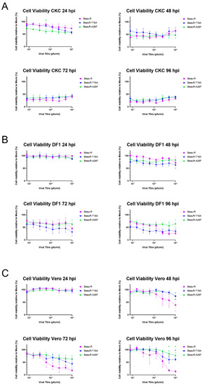 The same set-up was repeated in DF1 and Vero cells. Interestingly, differences were observed within these continuous cell lines (Figure 9B,C). DF1 cells (Figure 9B) infected with BeauR-T16A exhibited lower cell viability over all titres at 48 and 72 hpi than either BeauR-A26F or Beau-R; however, statistical significance was not reached. At 96 hpi, Beau-R showed lower cell viability when infected with higher titres (ns). Vero cells (Figure 9C) infected with >104 PFU of both BeauR-T16A and BeauR-A26F did not exhibit a reduction in cell viability comparable to Beau-R at 48–96 hpi, with statistical significance reached at 96 hpi. This indicates that the cytotoxic effects of both BeauR-T16A and BeauR-A26F are, therefore, not only dependent on cell type, but may also be dependent on the quantity of virus. This result may also have been influenced by the level of virus production present in Beau-R infected Vero cells in comparison to BeauR-A26F (Figure 2D).