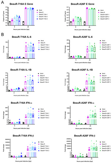 The E protein IC has been shown to be a pathogenicity factor in Betacoronavirus SARS-CoV, and mice inoculated with IC inactivated SARS-CoV exhibited decreased levels of Interleukin (IL)-1B and IL-6 [20]. In IBV, IC inactive viruses showed decreased upregulation of IL-6 in Vero cells and 10-day old embryonated eggs, indicating to the authors a role for the IC in the host’s innate immune response to IBV infection [18]. The upregulation of four innate immune factors, Interferon (IFN)-α, IFN-β, IL-6 and IL-1B, within the cell lysate of CK cells infected with either BeauR-T16A, BeauR-A26F or Beau-R (Figure 10) was examined. These factors were selected as they have previously been shown to be upregulated during IBV infection [53,54,55,56]. qRT-PCRs determined comparable levels of IBV-derived RNA between samples, suggesting comparable replication kinetics (Figure 10A). Comparable levels of IFN-α IFN-β, IL-6 and IL-1B upregulation within cells infected with rIBVs containing either a T16A or A26F mutation and Beau-R were also observed (Figure 10B). Whilst it may appear that the rIBVs with a T16A or A26F mutation show slightly higher levels of upregulation of IFN-α and IFN-β than parental Beau-R, statistical significance was not reached.