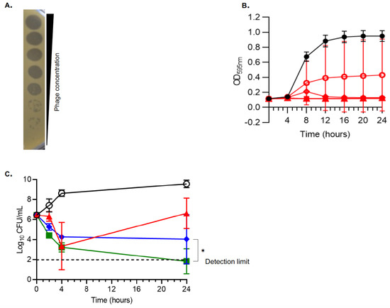 In vitro activity of the phage cocktail against MRSA AW7. (A) Diluted drop tests; (B) Turbidity assays; (C). Time-kill assays in absence and presence of vancomycin. (A) The phage cocktail was serially 10-fold diluted from top to bottom (starting concentration was 1010 PFU/mL). (B) Control without phages (closed black circles); phages at MOI = 0.01 (open red circles), MOI = 0.1 (open red diamonds), MOI = 1 (open red triangles), MOI = 10 (closed red squares), and MOI = 100 (closed red triangles). (C) Time-kill assays were performed by challenging MRSA AW7 with saline (open black circles); phage cocktail at MOI = 1 (closed red triangles), vancomycin at 2×MIC (closed blue diamonds), or a combination of both treatments (closed green squares). Means (±SD) of three independent experiments performed in triplicate are shown in panels B and C. One-way ANOVA with Tukey correction for multiple comparison statistical tests were performed to compare either areas under the curves of curves obtained at MOI = 0.1 (Figure 1B) or 24 h time-points (Figure 1C). CFU, colony forming unit; MIC, minimum inhibitory concentration; MOI, multiplicity of infection; PFU, plaque forming unit. * p < 0.05.