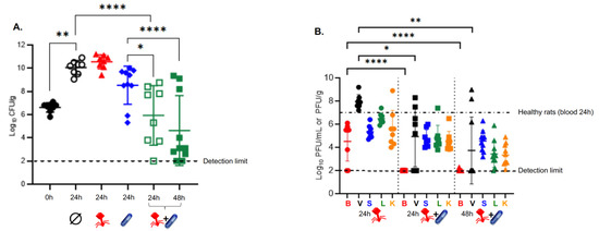 The mean phage concentration determined from the blood of infected rats after a 24-h IV infusion of the phage cocktail did not statistically differ from that determined from the blood of healthy rats (4.53 ± 1.70 log10 PFU/mL vs. 6.90 ± 0.41 log10 PFU/mL, respectively; p = 0.47) (Figure 2B). In contrast, subtherapeutic doses of vancomycin strongly affected the PK profiles of phages in the blood and across the organs tested. For example, there were very few phages recovered from the blood in 1 out of 10 rats 48 h after phage-vancomycin combined therapy (2.02 ± 0.08 log10 PFU/mL vs. 4.53 ± 1.70 log10 PFU/mL for phages alone in infected animals, respectively; p < 0.0001). Furthermore, glycopeptide treatment decreased phage availability within cardiac vegetations by ∆3.03 ± 1.16 log10 PFU/g at 24 h, and by ∆4.33 ± 1.10log10 PFU/g at 48 h (p < 0.05 and p < 0.01, respectively) (Figure 2B).