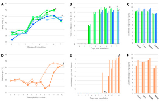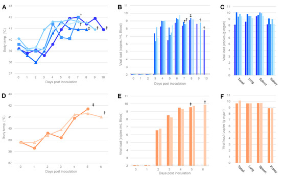 Body temperature and viral load of pigs inoculated with the isolated viruses. The body temperature (A,D) and viral copy numbers in the blood (B,E) and organs (C,F) of pigs inoculated with AQS-C-1-22 (blue, A–C) or AQS-P-20901-1 (orange, D–F) are shown. The identification numbers of pigs are indicated by the shape of markers or sorting order of bars: Nos. 1–5 are indicated by circles, triangles, squares, rhombi, and crosses (A) or ordered from left to right (B,C), respectively. Each symbol means euthanasia by humane endpoint (†) or death (‡), and the broken lines in B and E indicate the detection limit (=100 copies/mL of blood).