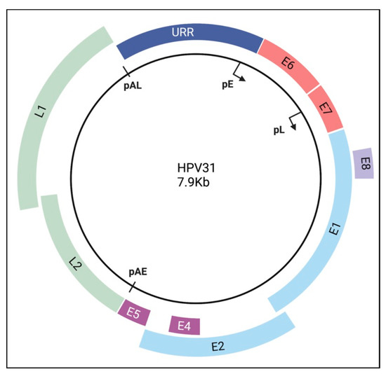 Genomic organization of high-risk HPV31. The open reading frames are designated by the color blocks. The early promoter (pE) is located upstream of the E6 ORF (p97 for HPV16, HPV31; p105 for HPV18), and the late promoter (pL) is located in the E7 ORF (p742 for HPV31, p811 for HPV18, p670 for HPV16). Expression of E8^E2C is driven by a promoter in the E1 ORF (not shown). The early polyadenylation site (pAE) is located at the end of the E5 ORF, and the late polyadenylation site (pAL) is located at the end of the L1 ORF. The upstream regulatory region (URR) is an untranslated region that contains the keratinocyte enhancer, the origin of replication, as well as binding sites for E1 and E2 and various transcription factors. Created with BioRender.com (accessed on 18 January 2022).