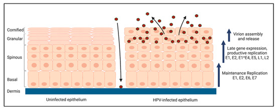 Overview of the HPV life cycle. HPVs infect the basal cells of the stratified epithelium through a microwound and transiently amplify to 50–100 copies per cell. Episomal copies are thought to be maintained at a low copy number in the undifferentiated, basal epithelial cells by replicating along with cellular DNA. Differentiation triggers the productive phase of the life cycle, resulting in high levels of late genes being expressed, including E1 and E2, that facilitate amplification of viral genomes to 100–1000 s of copies per cell. E1^E4 and E5 are also highly expressed upon differentiation and contribute to providing a replication-competent environment. E6 and E7 promote re-entry of differentiating cells back into the cell cycle to provide cellular factors required for viral replication. The expression of L1 and L2 results in the assembly of new virions that are released from the uppermost layers of the stratified epithelium. Created with BioRender.com (accessed on 10 August 2022).