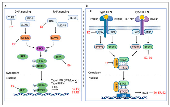 The limited coding capacity of the HPV genome renders the virus reliant on cellular factors for viral replication. However, epithelial differentiation normally results in an exit from the cell cycle. To provide an environment conducive to productive replication, HPV has evolved mechanisms to push differentiating cells back into the cell cycle, largely through E6 and E7′s ability to deregulate cell cycle control, including the degradation of the p53 and pRb tumor suppressors, respectively [25]. Productive replication occurs post-cellular DNA synthesis in a G2-arrested environment and relies on activation of DNA damage response pathways [30,31]. By restricting productive replication, late gene expression, and virion assembly to the uppermost layers of the stratified epithelium, HPV is able to avoid immune surveillance in the basal layers. However, HPV must also employ strategies to avoid activating an innate antiviral response during the productive phase of the viral life cycle.