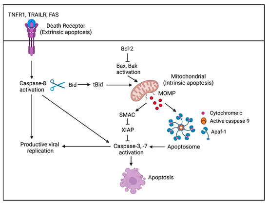 Overview of the extrinsic and intrinsic apoptotic pathways. The mitochondrial (intrinsic) pathway of apoptosis is activated by various cellular stresses (e.g., DNA damage, ER stress, ROS production, viral infection), resulting in mitochondrial outer membrane permeabilization (MOMP) and the release of cytochrome c, triggering formation of the apoptosome and activation of caspase-9. Caspase-9 then cleaves and activates the effector caspases, caspase-3 and -7, leading to apoptosis. The death receptor (extrinsic) pathway of apoptosis is stimulated by the binding of death receptor ligands (e.g., TNF, TRAIL, FASL) to their cognate death receptor and results in activation of the initiator caspase caspase-8. Under conditions of low levels of the inhibitor of apoptosis protein XIAP, which inhibits caspase-9, -3, -7, caspase-8 can directly cleave caspase-3. Under high XIAP conditions, caspase-8 must cleave the pro-apoptotic protein Bid to form tBid, which translocates to the mitochondria to stimulate MOMP by Bax/Bak. MOMP results in the release of SMAC, an inhibitor of XIAP, allowing for activation of caspases-9, -3, -7 [145]. Created with BioRender.com (accessed on 18 July 2022).