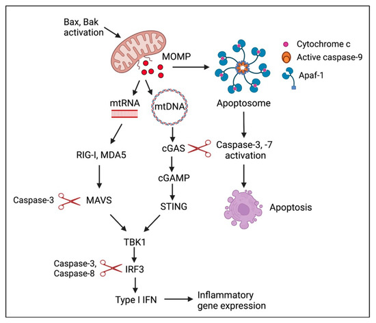 Apoptotic caspases block IFN production through cleavage of pathway components. Mitochondrial outer membrane permeabilization (MOMP) leads to the release of mtDNA as well as mtRNA that can be sensed by the cGAS/STING and MDA5/MAVS pathways, respectively, leading to Type I IFN production. Caspase activation resulting from MOMP blocks the IFN response by cleavage of various components of the cGAS/STING and RLR-MAVS signaling pathway. Activation of apoptotic caspase also suppresses IFN expression due to RNA and DNA virus infection (not shown). Created with BioRender.com (accessed on 18 July 2022).