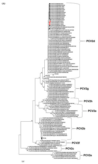- Franzo, G.; Segalés, J. Porcine Circovirus 2 (PCV-2) Genotype Update and Proposal of a New Genotyping Methodology. PLoS ONE 2018, 13, e0208585. [Google Scholar] [CrossRef]