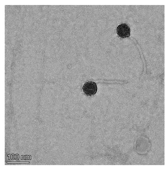 CsCl density gradient centrifugation of the phage concentrates was performed according to a previous method with some modifications []. A high-titer phage lysate was precipitated using polyethylene glycol (10% w/v PEG8000, 0.5 M NaCl) at 4 °C overnight and centrifuged at 12,000× g for 20 min at 4 °C. The pellet was then resuspended in SM buffer. The resulting phage preparation was placed on a CsCl step gradient comprising 1.3, 1.5, and 1.7 g/mL density layers and spun on an SW 32 Ti rotor (Optima XE-100 ultracentrifuge, Beckman Coulter, Brea, CA, USA) at 174,900× g (34,200 rpm) for 3 h at 4 °C. Phage pellets located near the density band of 1.5 g/mL were collected. Subsequently, 10 μL of purified phage (>1010 pfu/mL) was stained with 2% uranyl acetate. After drying at room temperature, the grids were examined using a transmission electron microscope at an acceleration voltage of 120 kV with a CCD camera.