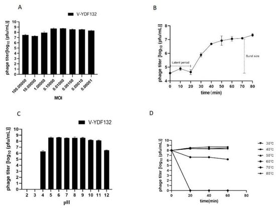 Biological characterization of V-YDF132. (A) Multiplicity of infection; (B) kinetics of progeny production in a single life cycle; (C) pH stability of V-YDF132. The phages were incubated for 1 h at different pH values; (D) thermal stability of the phages treated with different temperatures at different time points. Data points represent the mean values and standard deviations (SD) from three independent experiments.