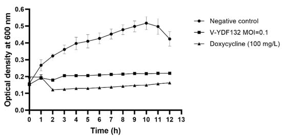 In the present study, we tested the effect of pH and temperature on the stability of the phage V-YDF132 by determining the change in the number of plaque-forming units (pfu). Plaque count showed that the phage V-YDF132 exhibited stability over a wide range of pH (5–11) (Figure 2C). The number of phages decreased by two orders of magnitude when pH decreased to 4.0, and the phages did not show any activity when pH decreased to 3.0. However, the number of the phage V-YDF132 decreased by only two orders of magnitude when pH increased to 12, which indicates that the phage V-YDF132 was more tolerant to alkaline conditions. The thermal stability test showed that the phage V-YDF132 was stable at 37, 40, and 50 °C for 1 h (Figure 2D). When the temperature reached 60 °C and the incubation time reached 20 min, the number of phages decreased by one order of magnitude, and there was a slight decrease in the number of phages with progression in time. Although V-YDF132 was not resistant to higher temperatures, it still showed better stability than the previously reported phage IME271 (40 °C) [].