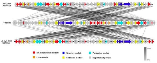 Multiple sequence alignment of phage genomes. The whole genomes of the Vibrio phage vB_VpS_PG28 (MT735630.2) and VH2_2019 (MN794238.1) and V-YDF132 were compared at the DNA level by using Easyfig. The black shading indicates sequence similarities between the genomes. The predicted functions of the proteins are indicated by different colors.