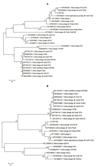 Phylogenetic tree showing V-YDF132 and other related phages of the Siphoviridae family and the Caudovirales order. The amino acid sequences of (A) the major capsid protein and (B) the terminase large subunit of the related phages were downloaded from the NCBI website.