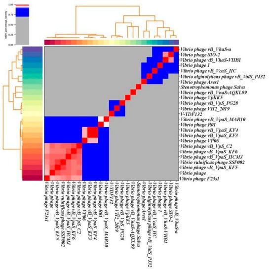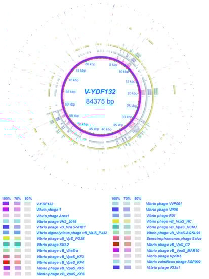 In Figure 5B, the resulting phylogenetic tree based on the terminase large subunit revealed that V-YDF132 clusters with the Vibrio phages vB_VpS_PG28 (MT735630.2) and VH2_2019 (MN794238.1). To further clarify the relationship between the Vibrio phages vB_VpS_PG28(MT735630.2), VH2_2019(MN794238.1), and V-YDF132, an in silico comparison of the genomes of the three phages and the genomes of 22 other phages of the Siphoviridae family with distant affinities was performed. Typically, phages within a genus are defined as sharing more than 35% of their genes [,]. On analyzing the results of the heatmap (Figure 6) and regarding the ANIm percentage identity data, V-YDF132 and the Vibrio phages vB_VpS_PG28 (MT735630.2) and VH2_2019 (MN794238.1) share genes above the threshold value, i.e., 82.88% and 80.97%, which were consistent with those of the phylogenetic analysis. It suggests that V-YDF132 and the Vibrio phages vB_VpS_PG28 (MT735630.2) and VH2_2019 (MN794238.1) belong to the same genus. We also carried out a comparative analysis of the whole-genome sequences of the same phages used in the phylogenetic analyses. Similar to the results of the terminase large subunit analysis, V-YDF132 grouped with the two phages and shared lower similarity with other phages (Figure 7). In conclusion, V-YDF132 is in the same genus as Vibrio phage vB_VpS_PG28 (MT735630.2) and VH2_2019 (MN794238.1).