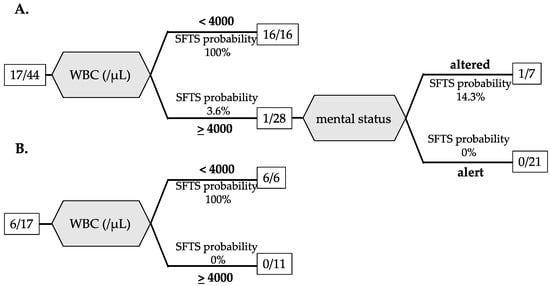To investigate factors that could differentiate between SFTS and JSF at the initial hospital visit, all cases were divided into a 7:3 test cohort (n = 44) and a validation cohort (n = 17). A decision tree analysis was performed by applying variables with significant differences in bivariate analysis that excluded variables not available in >20% of patients for a training cohort group. In the training cohort, the final classification using decision tree analysis extracted only two variables: WBC < 4000/μL and altered mental status. A WBC < 4000/μL led to SFTS probability of 100% (16/16). In the case that the patients with WBC > 4000/μL have altered mental status, the possibility of SFTS was 14.3% (Figure 1A). For the validation cohort, the area under the curve (AUC) by the Receiver Operating Characteristic (ROC) of the decision tree was 1.000.