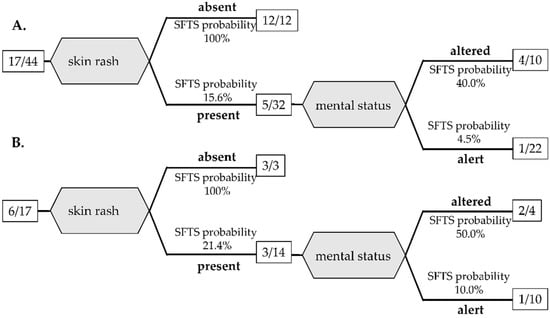 Decision tree classification of SFTS and JSF based on physical examination for the training cohort (A) and the validation cohort (B). The number in the square is the number of SFTS patients/total patients.